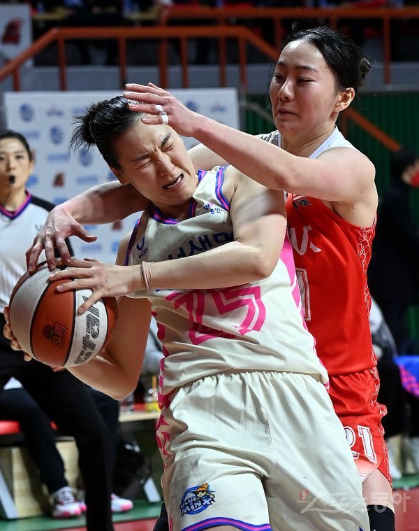 17일 부산 사직실내체육관에서 열린 ‘삼성생명 2021-2022 여자프로농구’ 부산 BNK썸과 용인 삼성생명의 경기에서 삼성생명 배혜윤이 BNK썸 김진영과 볼 다툼을 벌이고 있다.