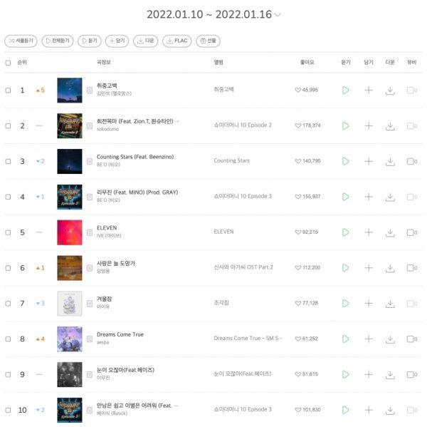 아울러 1월 3주차 주간차트에서는 높은 화제성과 시청률을 자랑하는 SBS 월화드라마 ‘그 해 우리는’ OST들의 순위가 대폭 상승해 눈길을 끌었다. 그룹 방탄소년단의 뷔, 10CM, 샘김, 이승윤, 김나영 등 음원 강자들이 총출동한 초호화 라인업을 자랑하는 ‘그 해 우리는’ OST들은 한 주 동안 평균 10계단 이상 순위 상승을 기록하며 뜨거운 인기를 증명했다.
