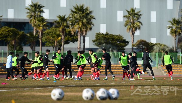18일 제주 공천포전지훈련센터에서 열린 U-23 한국 축구대표팀 전지훈련에서 선수들이 워밍업을 하고 있다.