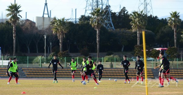 18일 제주 공천포전지훈련센터에서 열린 U-23 한국 축구대표팀 전지훈련에서 선수들이 패스 훈련을 하고 있다.