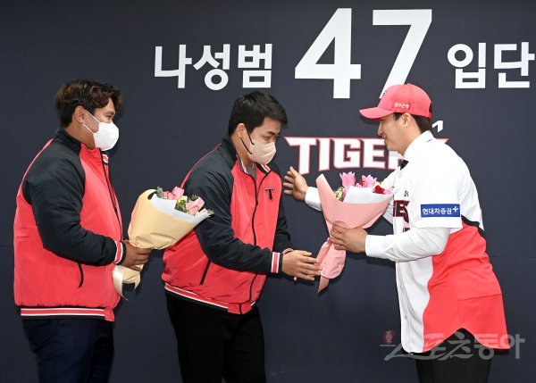 KIA 타이거즈는 19일 광주 기아챔피언스필드에서 계약기간 6년에 150억원으로 자유계약선수(FA) 계약을 한 나성범의 입단식을 개최했다. 나성범이 황대인과 장현식에게 축하 꽃다발을 받고 있다.