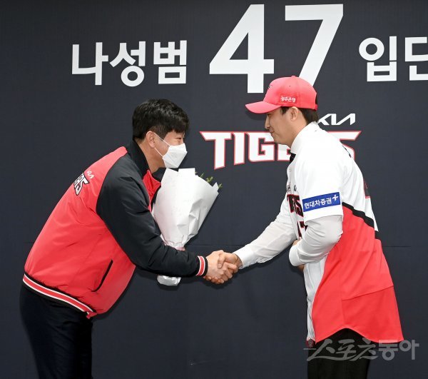 KIA 타이거즈는 19일 광주 기아챔피언스필드에서 계약기간 6년에 150억원으로 자유계약선수(FA) 계약을 한 나성범의 입단식을 개최했다. 나성범이 김종국 감독에게 축하 꽃다발을 받고 있다.