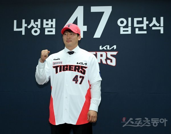 KIA 타이거즈는 19일 광주 기아챔피언스필드에서 계약기간 6년에 150억원으로 자유계약선수(FA) 계약을 한 나성범의 입단식을 개최했다. 나성범이 유니폼과 모자를 전달 받은 후 기념촬영을 하고 있다.