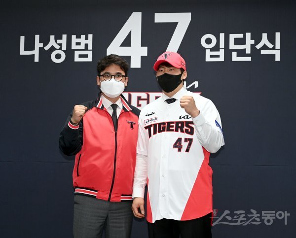 KIA 타이거즈는 19일 광주 기아챔피언스필드에서 계약기간 6년에 150억원으로 자유계약선수(FA) 계약을 한 나성범의 입단식을 개최했다. 나성범이 장정석 KIA 단장에게 유니폼과 모자를 전달 받은 후 기념촬영을 하고 있다.