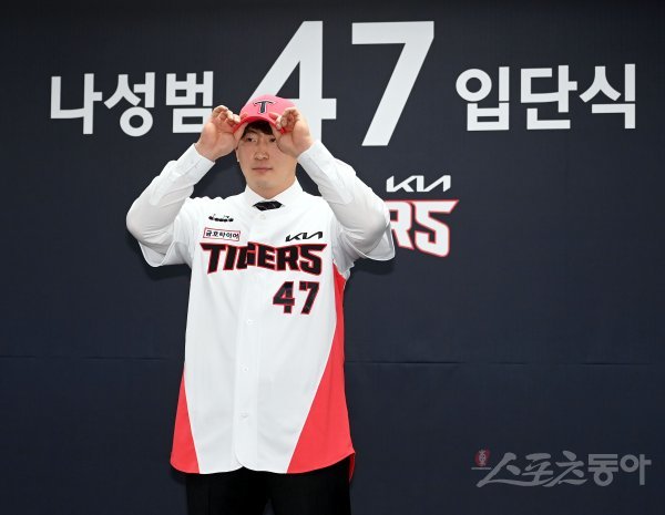 KIA 타이거즈는 19일 광주 기아챔피언스필드에서 계약기간 6년에 150억원으로 자유계약선수(FA) 계약을 한 나성범의 입단식을 개최했다. 나성범이 유니폼과 모자를 전달 받은 후 기념촬영을 하고 있다.