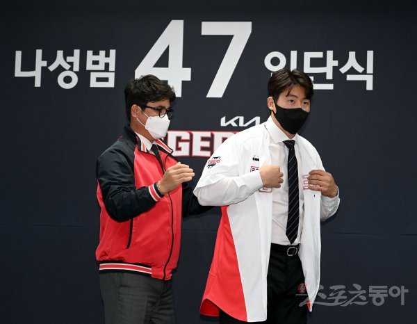 KIA 타이거즈는 19일 광주 기아챔피언스필드에서 계약기간 6년에 150억원으로 자유계약선수(FA) 계약을 한 나성범의 입단식을 개최했다. 나성범이 장정석 KIA 단장에게 유니폼을 전달 받고 있다.