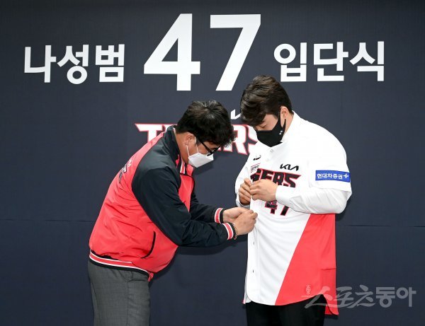 KIA 타이거즈는 19일 광주 기아챔피언스필드에서 계약기간 6년에 150억원으로 자유계약선수(FA) 계약을 한 나성범의 입단식을 개최했다. 나성범이 장정석 KIA 단장에게 유니폼을 전달 받고 있다.