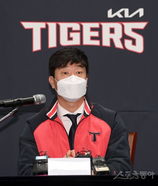 KIA 타이거즈는 19일 광주 기아챔피언스필드에서 계약기간 6년에 150억원으로 자유계약선수(FA) 계약을 한 나성범의 입단식을 개최했다. 입단식응 마치고 김종국 감독이 인터뷰를 하고 있다.