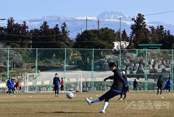 19일 제주 예래동체육공원에서 진행된 수원FC의 겨울 전지훈련에서 수원FC 선수들이 롱패스 훈련을 하고 있다.