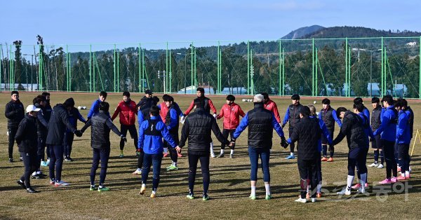 19일 제주 예래동체육공원에서 진행된 수원FC의 겨울 전지훈련에서 수원FC 선수들이 팀미팅을 마친 후 워밍업을 준비하고 있다.