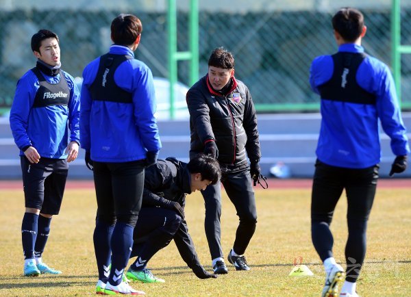 19일 제주 예래동체육공원에서 진행된 수원FC의 겨울 전지훈련에서 수원FC 이정수 코치가 선수들의 훈련을 지도하고 있다.
