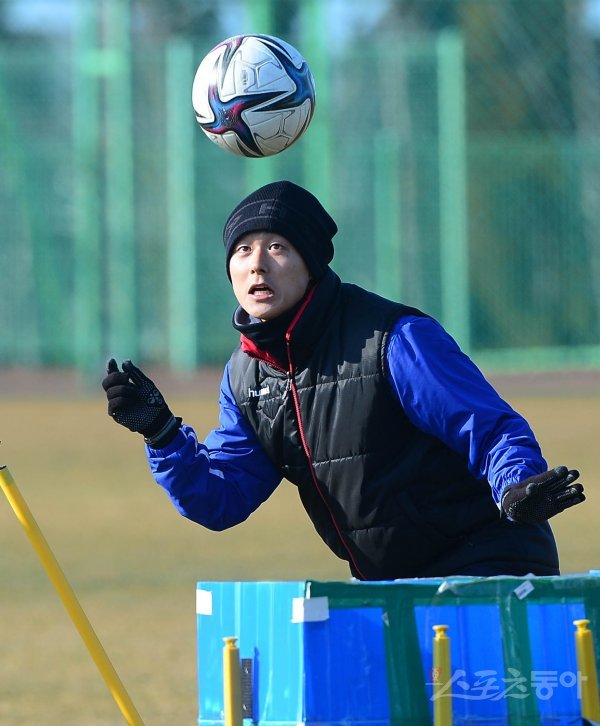 19일 제주 예래동체육공원에서 진행된 수원FC의 겨울 전지훈련에서 수원FC 이승우가 헤딩 패스 연습을 하고 있다.