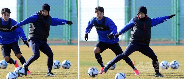 19일 제주 예래동체육공원에서 진행된 수원FC의 겨울 전지훈련에서 수원FC 이승우가 패스 훈련 수비를 하고 있다.