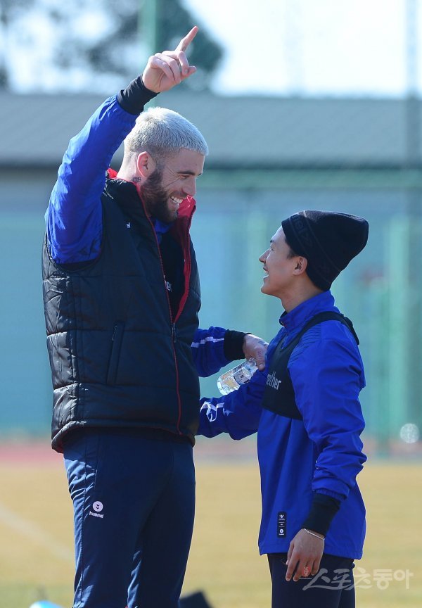 19일 제주 예래동체육공원에서 진행된 수원FC의 겨울 전지훈련에서 수원FC 라스와 이승우가 이야기를 하고 있다.