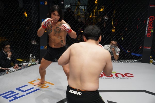 설영호(왼쪽)가 18일 잠실 롯데월드 아프리카 콜로세움에서 열린 아프리카TV-로드FC리그(ARC 007)에서 우치하 송을 상대로 탐색전을 벌이고 있다.