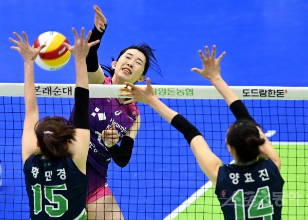 19일 경기도 수원체육관에서 ‘2021-2022 도드람 V리그’ 수원 현대건설과 인천 흥국생명의 여자부 경기가 열렸다. 흥국생명 김미연이 현대건설 블로커를 피해 스파이크를 날리고 있다. 수원 | 김민성 기자 marineboy@donga.com