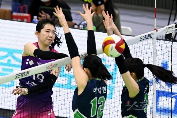 19일 경기도 수원체육관에서 ‘2021-2022 도드람 V리그’ 수원 현대건설과 인천 흥국생명의 여자부 경기가 열렸다. 흥국생명 김미연이 현대건설 블로커를 피해 스파이크를 날리고 있다. 수원 | 김민성 기자 marineboy@donga.com