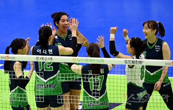 19일 경기도 수원체육관에서 ‘2021-2022 도드람 V리그’ 수원 현대건설과 인천 흥국생명의 여자부 경기가 열렸다. 현대건설 야스민이 5연속 서브득점을 올린 뒤 동료들과 기쁨을 나누고 있다. 수원 | 김민성 기자 marineboy@donga.com