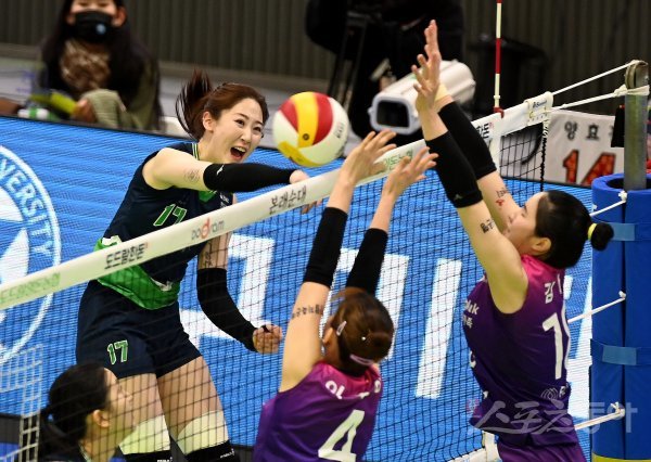 19일 경기도 수원체육관에서 ‘2021-2022 도드람 V리그’ 수원 현대건설과 인천 흥국생명의 여자부 경기가 열렸다. 현대건설 고예림이 흥국생명 블로커를 피해 스파이크를 날리고 있다. 수원 | 김민성 기자 marineboy@donga.com