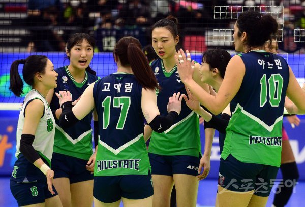 19일 경기도 수원체육관에서 ‘2021-2022 도드람 V리그’ 수원 현대건설과 인천 흥국생명의 여자부 경기가 열렸다. 현대건설이 흥국생명을 상대로 세트 스코어 3-1로 승리한 뒤 선수들이 코트에서 기쁨을 나누고 있다. 수원 | 김민성 기자 marineboy@donga.com