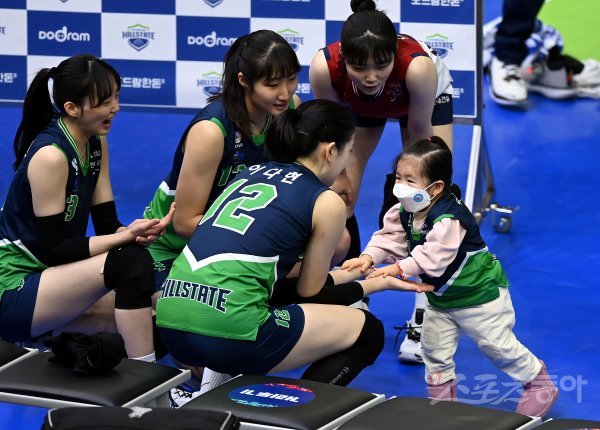 19일 경기도 수원체육관에서 ‘2021-2022 도드람 V리그’ 수원 현대건설과 인천 흥국생명의 여자부 경기가 열렸다. 현대건설이 흥국생명을 상대로 세트 스코어 3-1로 승리한 뒤 선수들이 황민경의 조카와 즐거운 시간을 보내고 있다.