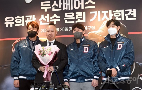 현역 은퇴 의사를 밝힌 두산 유희관이 20일 서울 잠실야구장에서 열린 은퇴 기가회견에서 홍건희, 박세혁, 최원준과 기념촬영을 하고 있다.