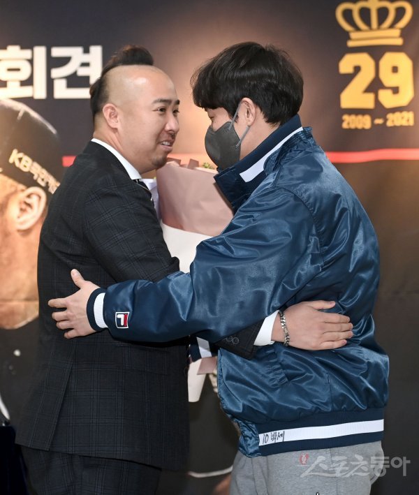현역 은퇴 의사를 밝힌 두산 유희관이 20일 서울 잠실야구장에서 열린 은퇴 기가회견에서 박세혁에게 꽃다발을 받고 있다.