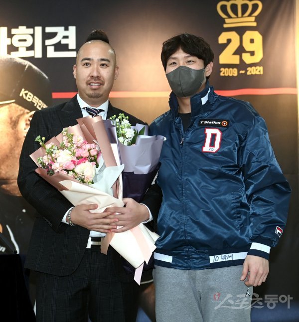 현역 은퇴 의사를 밝힌 두산 유희관이 20일 서울 잠실야구장에서 열린 은퇴 기가회견에서 박세혁에게 꽃다발을 받은 후 기념촬영을 하고 있다.