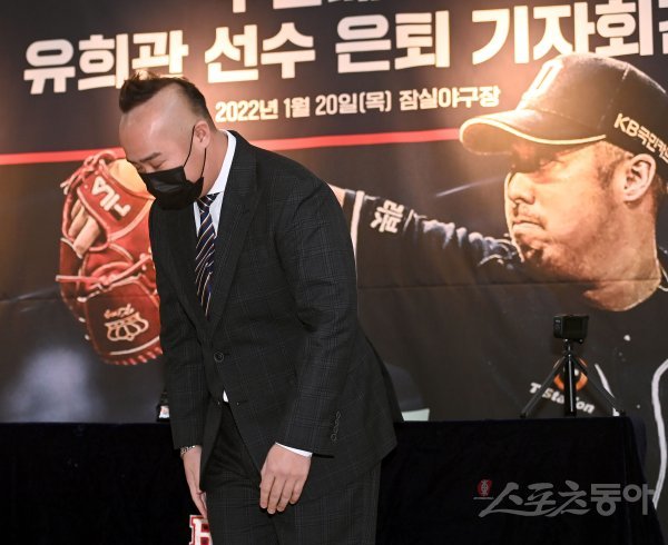 현역 은퇴 의사를 밝힌 두산 유희관이 20일 서울 잠실야구장에 가진 은퇴 기자회견에서 인사하고 있다.