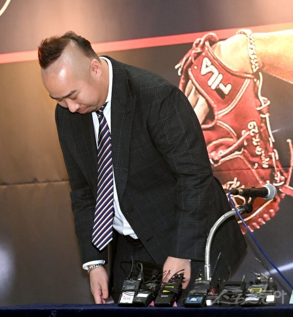 현역 은퇴 의사를 밝힌 두산 유희관이 20일 서울 잠실야구장에서 은퇴 기자회견을 마치고 인사하고 있다.