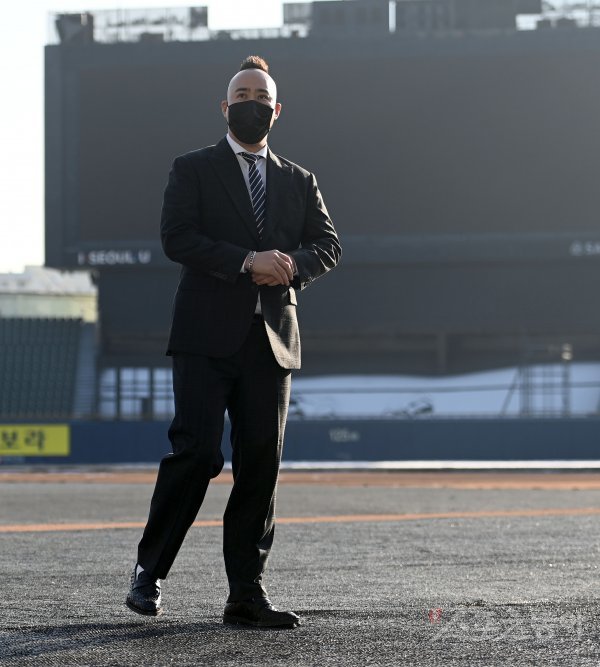 현역 은퇴 의사를 밝힌 두산 유희관이 20일 서울 잠실야구장에서 은퇴 기자회견을 마치고 그라운드을 걸어보고 있다.