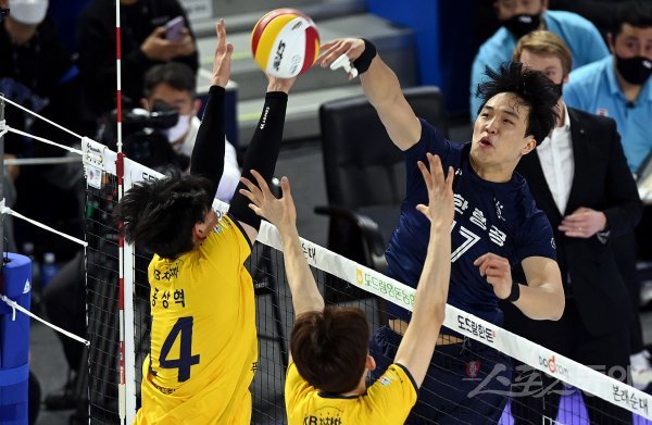 20일 인천 계양체육관에서 ‘2021-2022 도드람 V리그’ 인천 대한항공과 의정부 KB손해보험의 남자부 경기가 열렸다. 대한항공 임동혁이 KB손해보험 블로커를 피해 공격을 펼치고 있다. 인천 | 김민성 기자 marineboy@donga.com