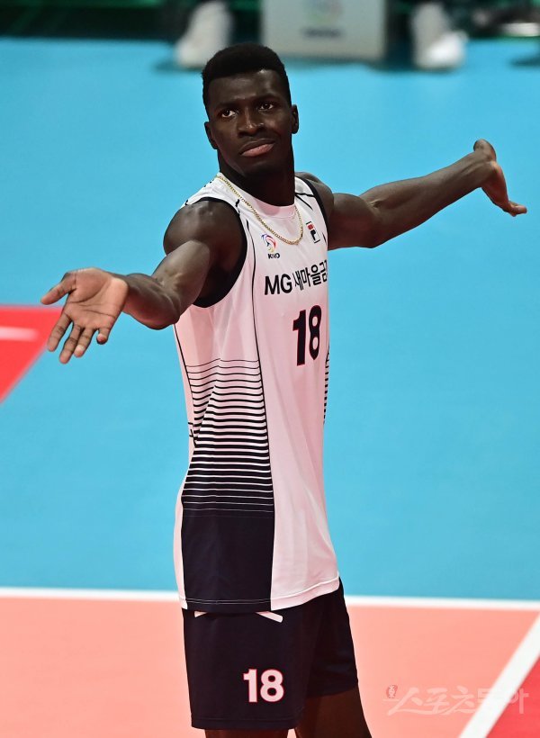 23일 광주 페퍼스타디움에서 열린 ‘도드람 2021~2022 V-리그 올스타전‘ K-스타와 V-스타의 경기에서 V-스타 케이타가 득점에 성공한 후 세리머니를 하고 있다.