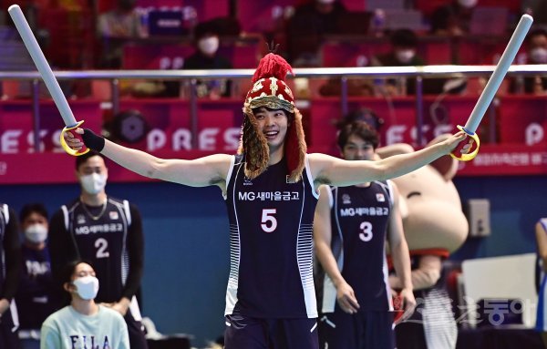 23일 광주 페퍼스타디움에서 열린 ‘도드람 2021~2022 V-리그 올스타전‘ K-스타와 V-스타의 경기에서 K-스타 조재영이 조자룡 복장을 입고 코트에 들어서고 있다.