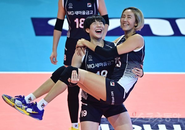 23일 광주 페퍼스타디움에서 열린 ‘도드람 2021~2022 V-리그 올스타전‘ K-스타와 V-스타의 경기에서 K-스타 이소영이 득점에 성공한 한송이를 업고 있다.