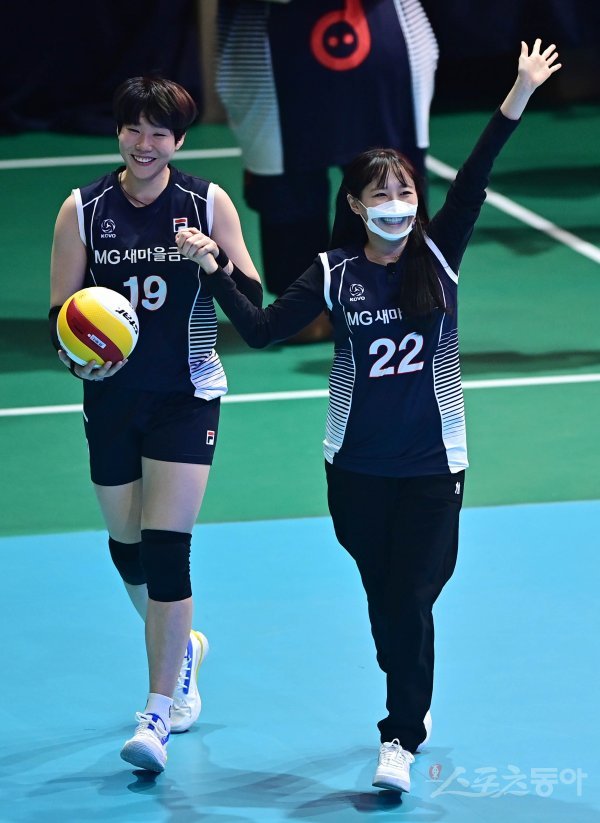 23일 광주 페퍼스타디움에서 열린 ‘도드람 2021~2022 V-리그 올스타전‘ K-스타와 V-스타의 경기에서 K-스타 이소영이 가수 츄의 손을 잡고 코트로 향하고 있다.