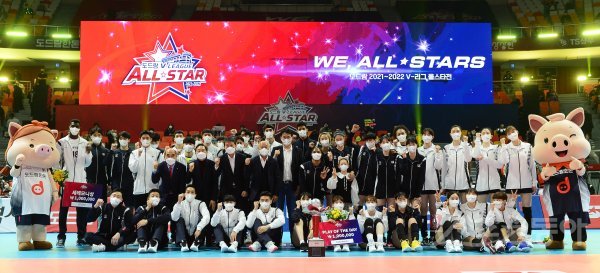 23일 광주 페퍼스타디움에서 열린 ‘도드람 2021~2022 V-리그 올스타전‘ K-스타와 V-스타의 경기가 종료된 후 K-스타, V-스타 선수들과 조원태 한국배구연맹 총재를 비롯한 박광욱 도드람양돈농협 조합장 등 참석자들이 기념 촬영을 하고 있다.