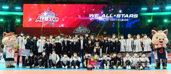23일 광주 페퍼스타디움에서 열린 ‘도드람 2021~2022 V-리그 올스타전‘ K-스타와 V-스타의 경기가 종료된 후 K-스타, V-스타 선수들과 조원태 한국배구연맹 총재를 비롯한 박광욱 도드람양돈농협 조합장 등 참석자들이 기념 촬영을 하고 있다.