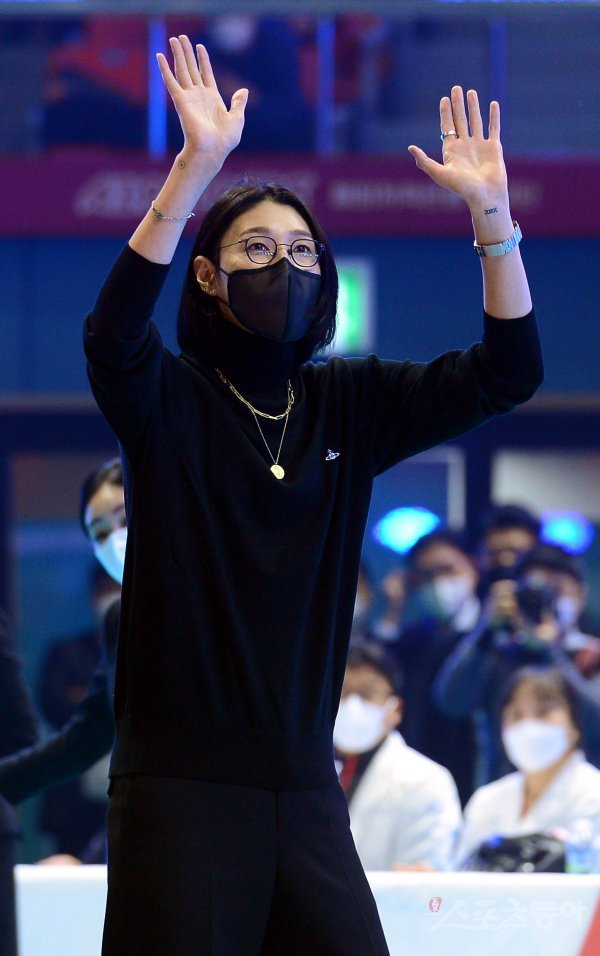 23일 광주 페퍼스타디움에서 열린 ‘도드람 2021~2022 V-리그 올스타전‘ K-스타와 V-스타의 경기에 앞서 김연경이 몬트리올 올림픽 레전드 감사 이벤트에서 관중들에게 인사하고 있다.