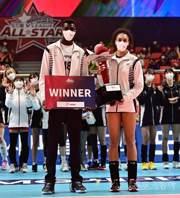 23일 광주 페퍼스타디움에서 열린 ‘도드람 2021~2022 V-리그 올스타전‘ K-스타와 V-스타의 경기에서 K-스타에 3세트 총점 41-40으로 승리를 거둔 V-스타 케이타와 엘리자벳이 포즈를 취하고 있다.