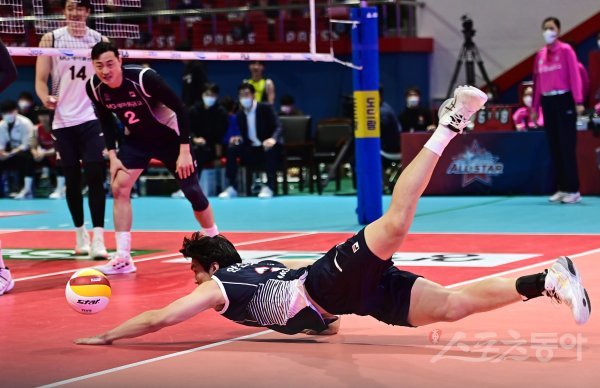 23일 광주 페퍼스타디움에서 열린 ‘도드람 2021~2022 V-리그 올스타전‘ K-스타와 V-스타의 경기에서 K-스타 조재성이 디그를 하고 있다.