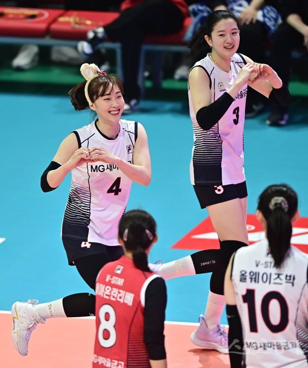 23일 광주 페퍼스타디움에서 열린 ‘도드람 2021~2022 V-리그 올스타전‘ K-스타와 V-스타의 경기에서 V-스타 황민경이 득점에 성공한 후 댄스 세리머니를 하고 있다.