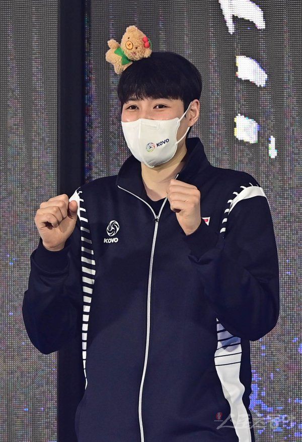 23일 광주 페퍼스타디움에서 열린 ‘도드람 2021~2022 V-리그 올스타전‘ K-스타와 V-스타의 경기에 앞서 K-스타 김희진이 소원을 말해봐 이벤트에서 곰 세 마리 율동을 하고 있다.