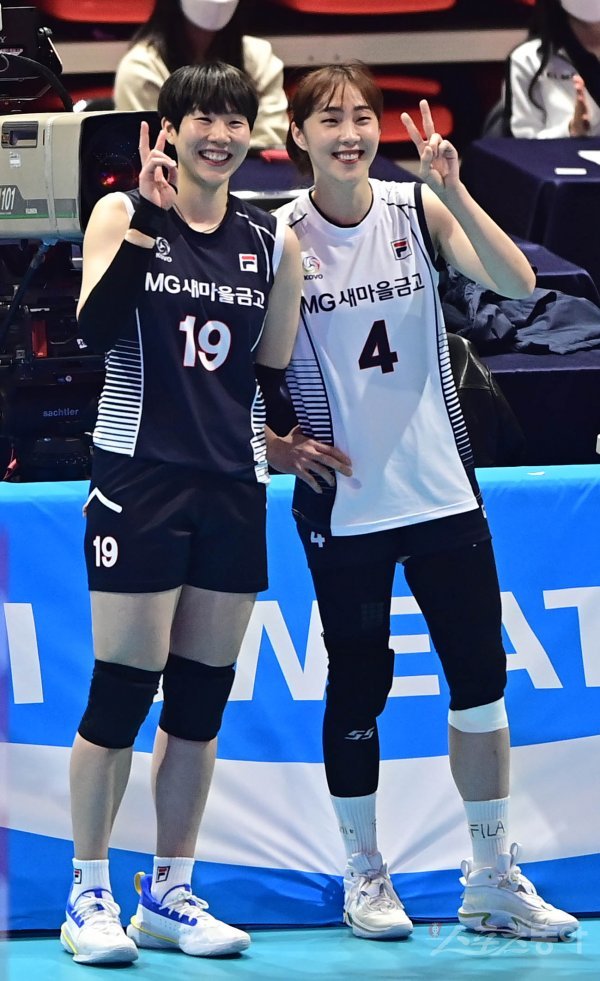 23일 광주 페퍼스타디움에서 열린 ‘도드람 2021~2022 V-리그 올스타전‘ K-스타와 V-스타의 경기에서 이소영과 황민경이 스파이크 서브 퀸 컨테스트를 앞두고 포즈를 취하고 있다.