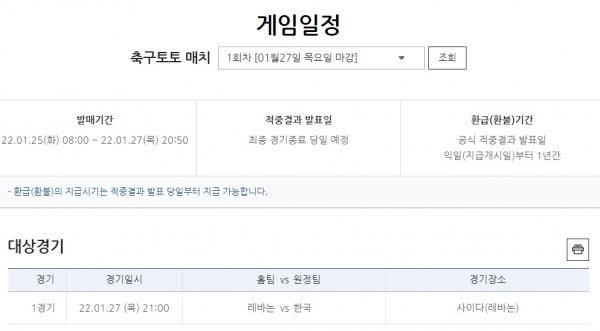 국민체육진흥공단에서 발행하는 체육진흥투표권 스포츠토토의 수탁사업자 스포츠토토코리아가 27일 오후 9시(한국시간) 레바논 사이다에서 열리는 2022카타르월드컵 아시아 최종예선 A조 7차전 대한민국(원정)-레바논(홈)전을 대상으로 축구토토 매치 1회차 게임을 발매한다.전반 및 최종 스코어 맞히기…27일(목) 오후 8시50분 발매 마감