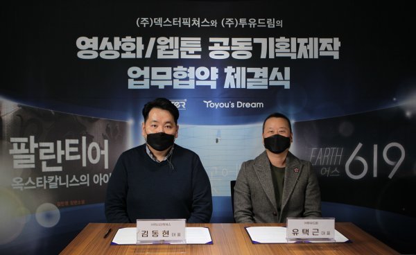 웹툰 콘텐츠 전문기업 (주)투유드림(대표 유택근)이 시각특수효과(VFX)·콘텐츠 전문기업 (주)덱스터스튜디오의 자회사 (주)덱스터픽쳐스(대표 김동현)와 24일 ‘웹툰·영상화 공동기획제작 업무 협약’을 체결했다.웹툰 제작력과 영상 제작력 합쳐 최적의 시너지 모색