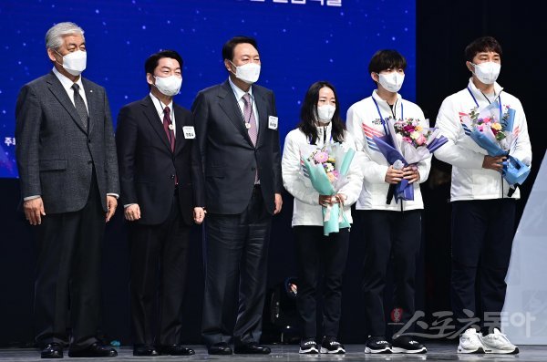 25일 서울 송파구 올림픽공원 올림픽홀에서 열린 ‘2022 제24회 베이징동계올림픽대회 대한민국 선수단 결단식’에서 이상헌 더블어민주당 의원, 안철수 국민의당 대선후보, 윤석열 국민의힘 대선후보가 크로스컨트리스키 이채원, 스피드스케이팅 정재원, 임명석 여자컬링 감독과 꽃다발 전달 후 기념 촬영을 하고 있다.