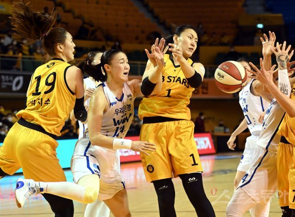 26일 청주체육관에서 열린 ‘삼성생명 2021-22 여자프로농구’는 ‘ KB스타즈와 우리은행 경기에서 KB스타즈 염윤아와 우리은행 김정은이 리바운드 볼을 다투고 있다.