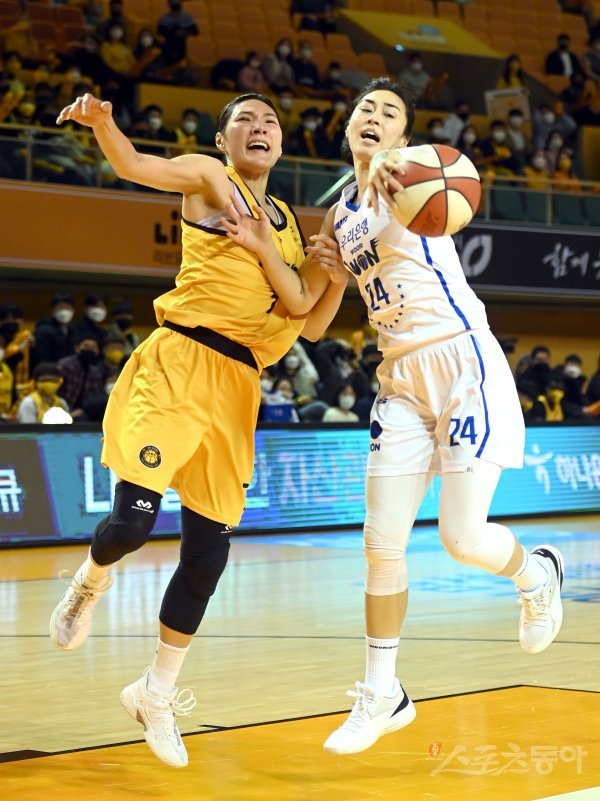 26일 청주체육관에서 열린 ‘삼성생명 2021-22 여자프로농구’는 ‘ KB스타즈와 우리은행 경기에서 KB스타즈 최희진과 우리은행 김소니아가 리바운드 볼을 다투고 있다.