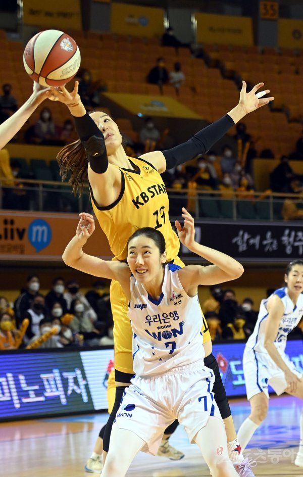 26일 청주체육관에서 열린 ‘삼성생명 2021-22 여자프로농구’는 ‘ KB스타즈와 우리은행 경기에서 KB스타즈 박지수와 우리은행 박혜진이 리바운드 볼을 다투고 있다.